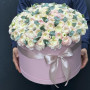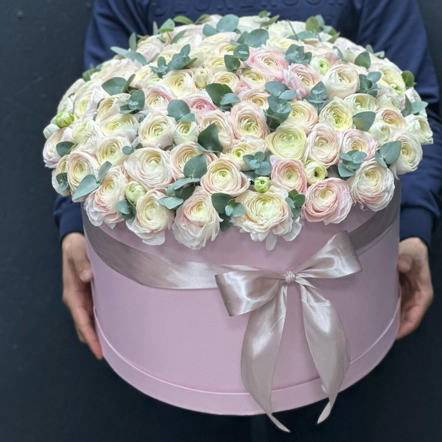 На фото 101 белый ранункулюс в коробке. В составе: ранункулюс 101 шт, оазис флористический 2 шт, шляпная коробка (xl) 1 шт, . Все цветы свежие и ароматные, букет красиво оформлен и отлично подходит для подарка. Доступна доставка цветов или самовывоз.