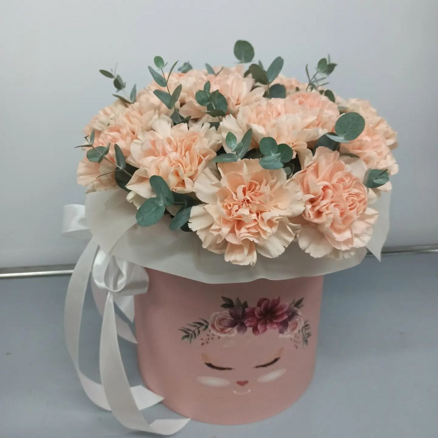 21 красивая кремовая гвоздика, оформленная в шляпную коробку, станет прекрасным подарком ко дню рождения или любому другому празднику. Гвоздики - символ элегантности, изысканности и роскоши, а кремовый цвет придает букету легкость и воздушность, создавая атмосферу нежности и уюта. Шляпная коробка подчеркивает красоту и оригинальность букета, а атласные ленты с бантами добавляют ему еще больше шарма и роскоши. Такой букет будет радовать получателя своим изысканным видом и приятным ароматом, напоминая ему о вашей любви и заботе.