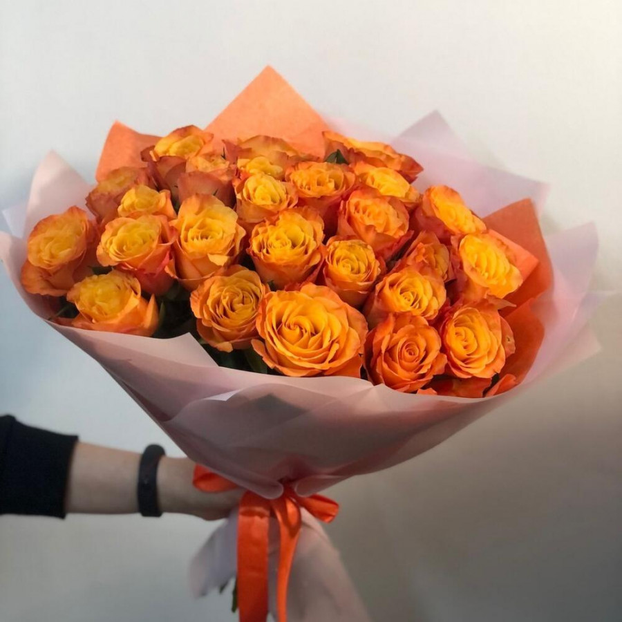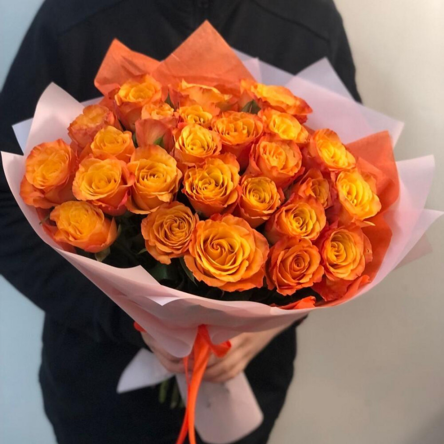 На фото букет из 25 оранжевых роз. В составе: роза 25 шт, дизайнерская упаковка 1 шт, атласная лента 1 шт, . Все цветы свежие и ароматные, букет красиво оформлен и отлично подходит для подарка. Доступна доставка цветов или самовывоз.