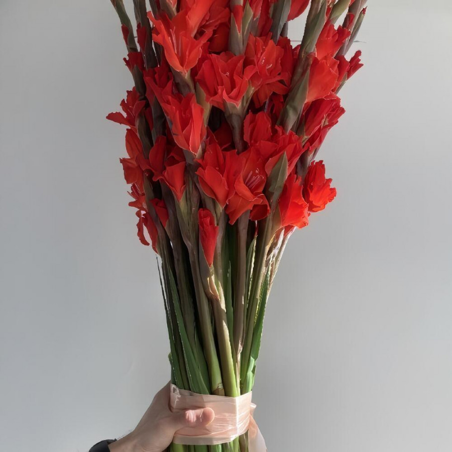 На фото букет из 29 красных гладиолусов. В составе: гладиолус 29 шт, атласная лента 1 шт, . Все цветы свежие и ароматные, букет красиво оформлен и отлично подходит для подарка. Доступна доставка цветов или самовывоз.