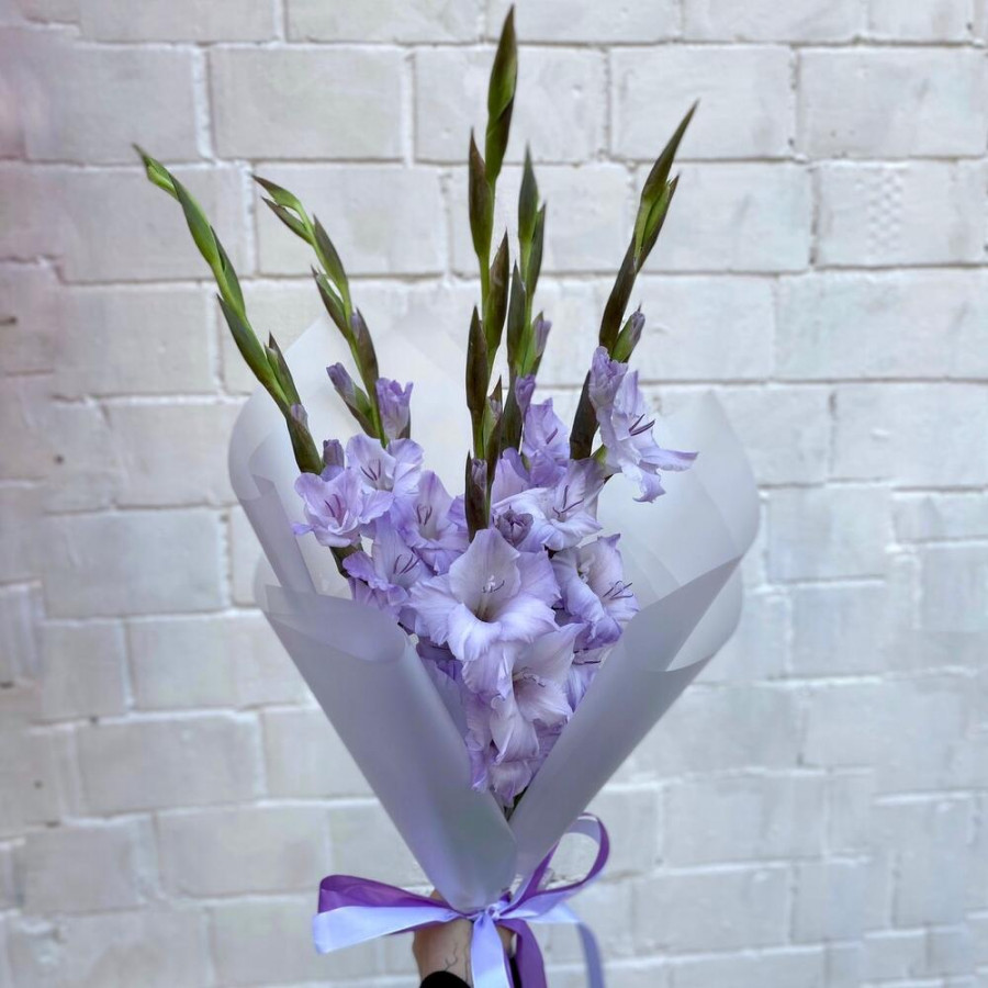 На фото букет из 5 сиреневых гладиолусов. В составе: гладиолус 5 шт, дизайнерская упаковка 1 шт, . Все цветы свежие и ароматные, букет красиво оформлен и отлично подходит для подарка. Доступна доставка цветов или самовывоз.
