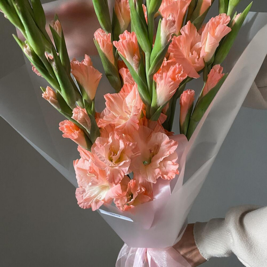 На фото букет из 7 коралловых гладиолусов. В составе: гладиолус 7 шт, дизайнерская упаковка 1 шт, . Все цветы свежие и ароматные, букет красиво оформлен и отлично подходит для подарка. Доступна доставка цветов или самовывоз.