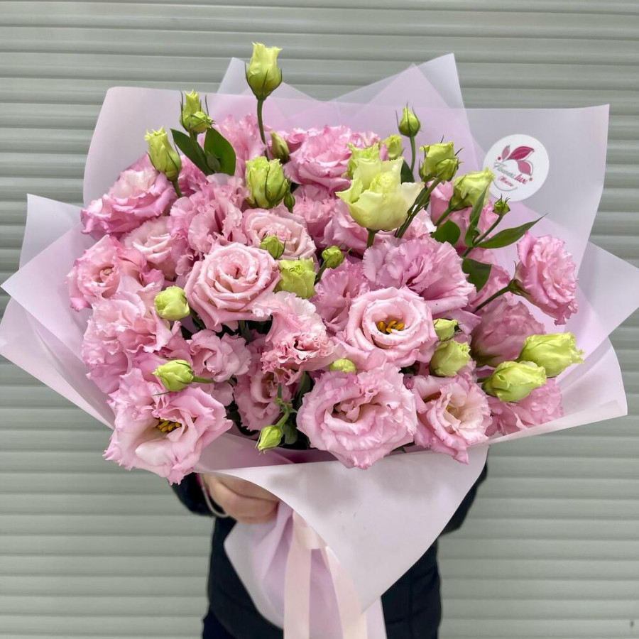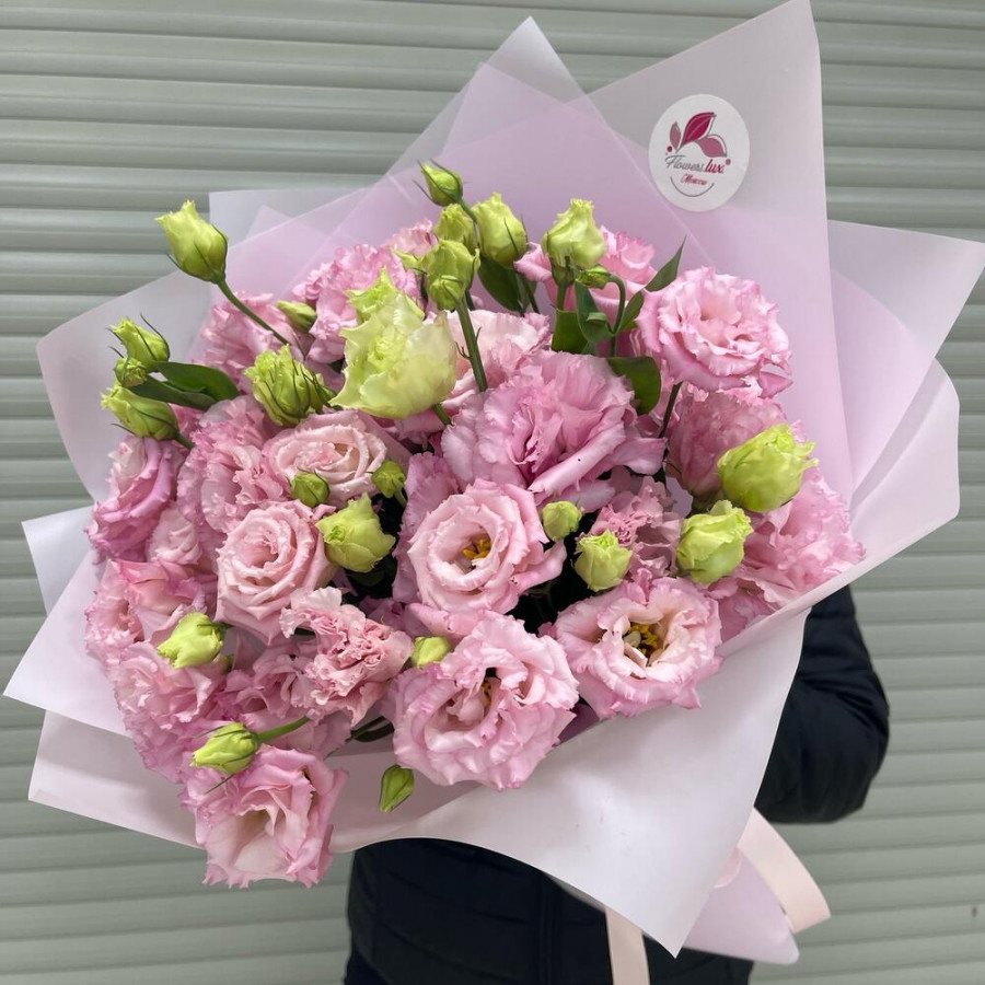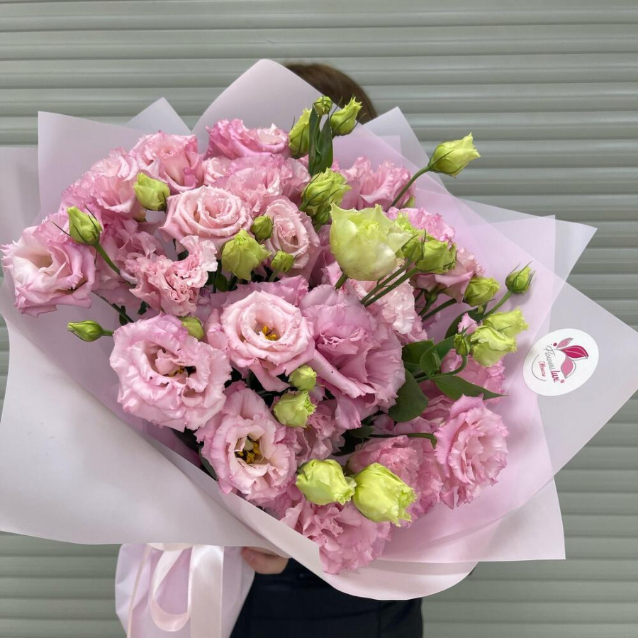 Упаковка дизайнерская - 3 шт. эустома розовая - 11 шт. бант атласный - 1 шт.