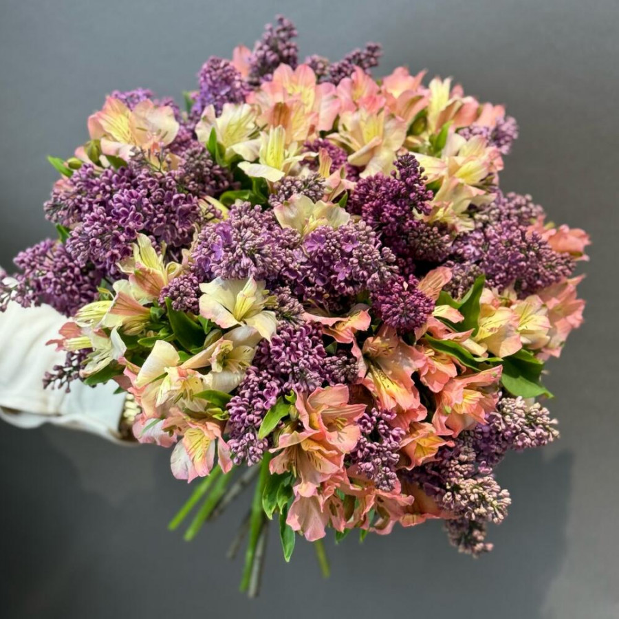 На фото букет из альстромерий и сирени. В составе: сирень 17 шт, альстромерия 14 шт, атласная лента 2 шт, . Все цветы свежие и ароматные, букет красиво оформлен и отлично подходит для подарка. Доступна доставка цветов или самовывоз.