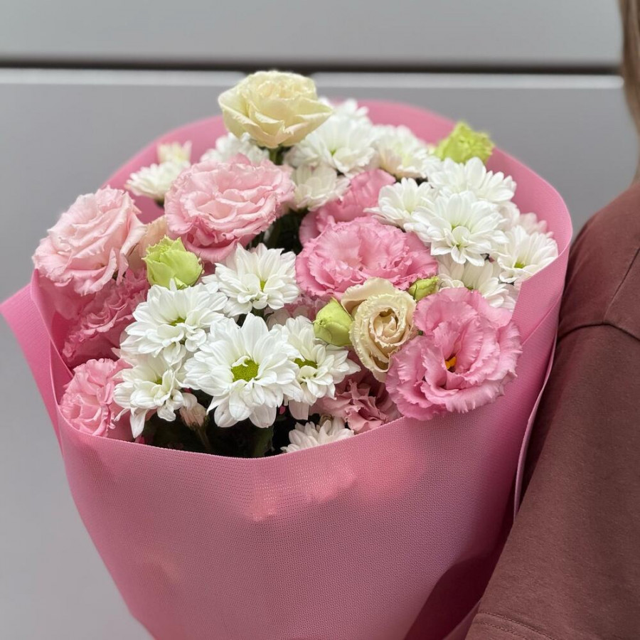 На фото букет «нежность облаков». В составе: хризантема кустовая 3 шт, эустома (лизиантус) 2 шт, дизайнерская упаковка 2 шт, атласная лента 1 шт, . Все цветы свежие и ароматные, букет красиво оформлен и отлично подходит для подарка. Доступна доставка цветов или самовывоз.