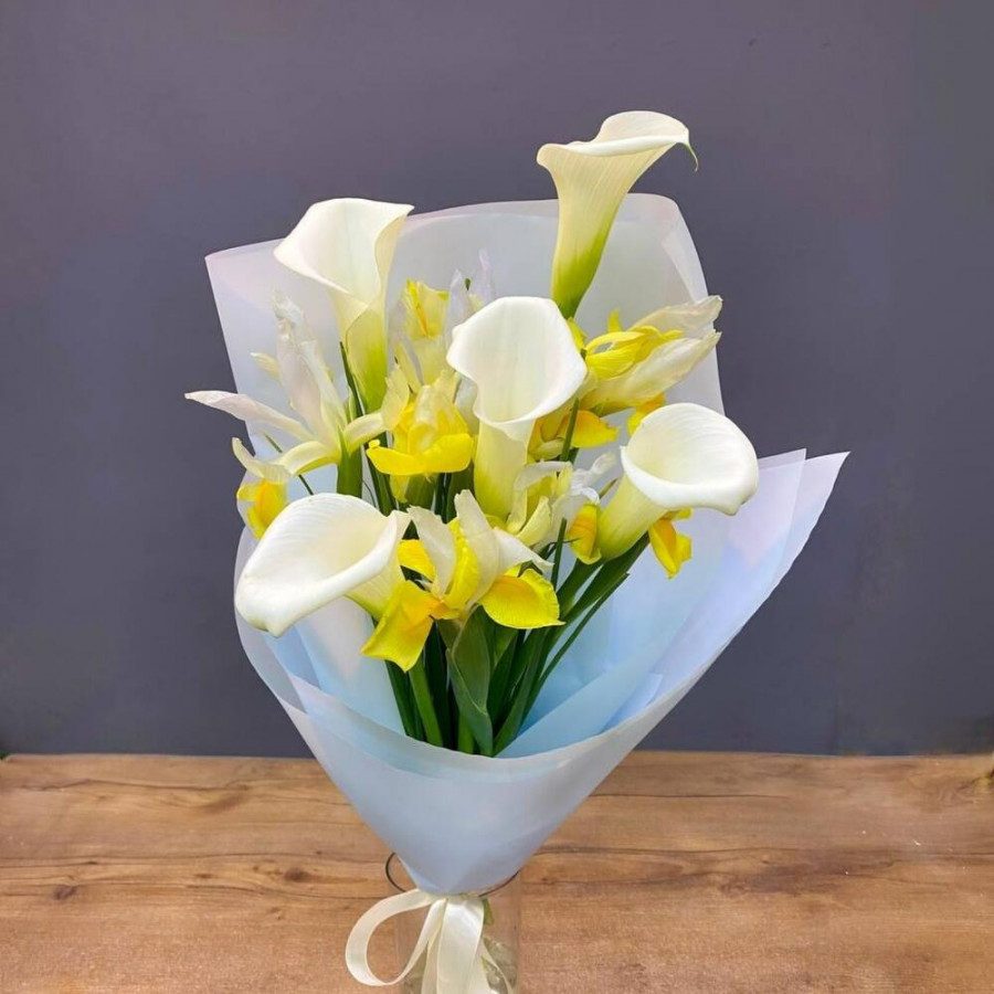 На фото букет из желтых ирисов и беллых калл. В составе: ирис 9 шт, калла 5 шт, дизайнерская упаковка 1 шт, атласная лента 1 шт, . Все цветы свежие и ароматные, букет красиво оформлен и отлично подходит для подарка. Доступна доставка цветов или самовывоз.